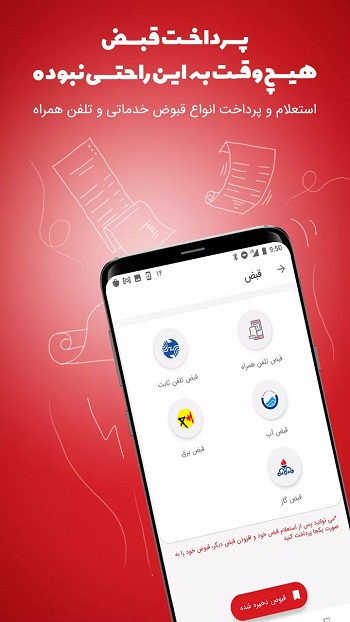 و انواع قبوض خدماتی مثل قبض برق، آب، گاز، تلفن و تلفن همراه را پرداخت کنید.