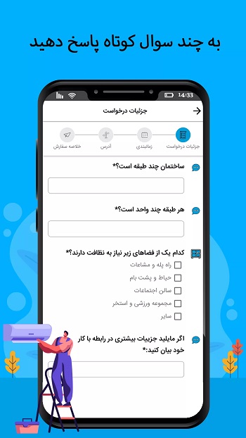 و تجربهای متفاوت از دریافت خدمات (خدمات نظافتی، کارواش، تعمیرات، پرستاری و …) خواهید داشت. اپلیکیشن Khedmatazma دسترسی به متخصصان خدمات را آسان می کند.