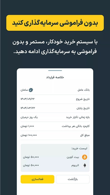 با قابلیت خرید خودکار صراف، بدون فراموشی سرمایهگذاری مستمر داشته باشید. کافیست بازههای زمانی،