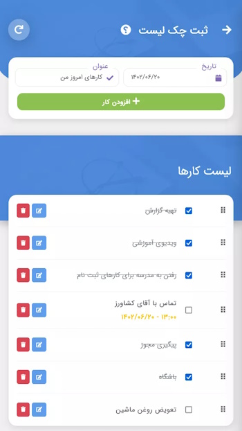 به راحتی میتوانید وظایف و فعالیت ها را به صورت روزانه و یا دوره ای ، با امکان زمان بندی ثبت کنید.